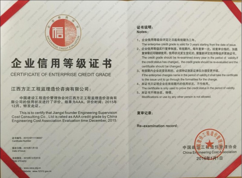 江西方正工程監(jiān)理造價(jià)咨詢(xún)有限公司于二OO三年五月在南昌市工商行政管理局注冊(cè)(注冊(cè)號(hào):360100210024211),成立的有限責(zé)任公司,先后取得建設(shè)部及江西省建設(shè)廳頒發(fā)的建設(shè)施工工程造價(jià)咨詢(xún)企業(yè)資質(zhì)、招投標(biāo)代理機(jī)構(gòu)資質(zhì)、工程監(jiān)理資質(zhì)及江西省財(cái)政廳頒發(fā)的采購(gòu)代理資質(zhì),是專(zhuān)門(mén)從事工業(yè)與民用建筑工程造價(jià)咨詢(xún)、工程建設(shè)招投標(biāo)代理、工程監(jiān)理及采購(gòu)代理的公司。